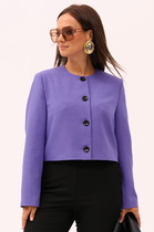 Жакет женский прямого силуэта на частичной контрастной подкладке. Жакет однобортный, длинной до середины бедра с округлой формой борта. Полочка с отрезными бочками и вытачкой. В нижней части расположены прорезные карманы с клапаном. На левом клапане расположен декоративный элемент. Спинка с отрезными бочками и отрезной кокеткой. Рукав втачной, полной длинны. По низу рукава обработана имитация шлицы с отделочными строчками и декоративными пуговицами. Воротник в жакете втачной с отрезной стойкой и лацканами. Жакет застегивается на петли и отделочные пуговицы. По воротнику, лацкану, борту, клапанам и швам спинки и полочки прострочены отделочные строчки.