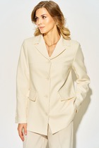 Жакет изготовлен из костюмной ткани, прямого силуэта, на подкладке, двухбортный, застежка на декоративную пуговицу и потайную кнопку. Перед с нагрудными выточками, входящими в прорезной карман в рамку, с боковыми рельефами, переходящими на спинку. Спинка со средним швом и шлицей. Воротник отложной с фигурными лацканами. Рукав втачной, двухшовный, на подкладке. Лаконичный фасон и женственность, индивидуальность и стиль - именно такими словами можно охарактеризовать этот жакет, который идеально подойдёт и для работы в офисе, и для торжественного случая.