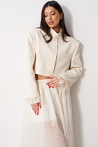 Жакет прямого силуэта на подкладке. Спинка со средним швом. На полочке нагрудная вытачка переведена в прорезной карман с клапаном и листочкой. Линия плеч расширена. Рукава втачные, длинные, двухшовные. Воротник отложной, пиджачного типа на отрезной стойке. Однобортная застежка на петли и пуговицы. Отделочные детали из трикотажного гофре по низу рукава и самого изделия создают имитацию рубашки.