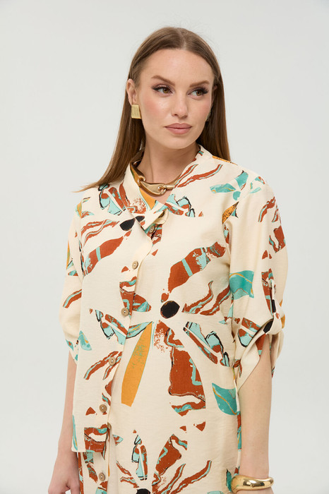 Жакет рубашечного типа прямого силуэта с асимметричным низом. Рукав втачной со спущенной линией плеча, фиксируется на пату. Застежка центральная на петли и пуговицы, смещённая по косой. Воротник отложной на стойке до половины спинки.