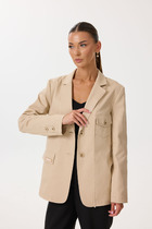 Жакет рубашечного типа прямого силуэта с асимметричным низом. Рукав втачной со спущенной линией плеча, фиксируется на пату. Застежка центральная на петли и пуговицы, смещённая по косой. На левой полочке накладной карман с клапаном. Воротник отложной на стойке до половины спинки.