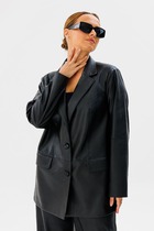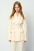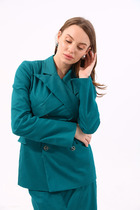 Жакет прямого силуэта, воротник пиджачного типа, рукав одношовный, втачной с незначительно спущенной линией плеча, длинный, с притачной манжетой, декорированной разрезом. По линии ткани настрачная кулиса с завязками из основной ткани. Застежка центрально-бортовая. Линия низа верхней части фигурная ассиметричная.