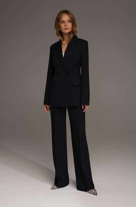 Классический приталенный жакет из текстильной ткани. Детали: жакет с отрезными бочками и нагрудными вытачками, пиджачный воротник, прорезные карманы, двубортная застежка на петли и пуговицы, спинка со средним швом, втачные двухшовные рукава, жакет на подкладке