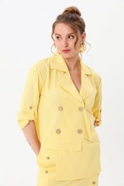Классический приталенный жакет из текстильной ткани. Детали: жакет с отрезными бочками и нагрудными вытачками, пиджачный воротник, прорезные карманы, двубортная застежка на петли и пуговицы, спинка со средним швом, втачные двухшовные рукава, жакет на подкладке