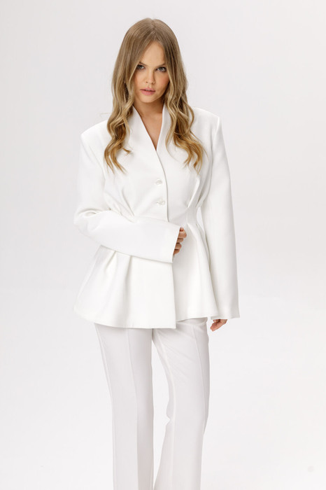 Детали: полуприлегающий силуэт с расширенными плечами, цельнокроеный воротник-стойка, застежка на петли и пуговицы, рукава втачные двушхшовные, жакет на подкладке