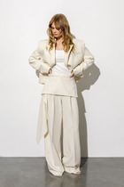 Детали: жакет прямого силуэта, свободный покрой, расширенная линия плеч, пиджачный воротник, перед с прорезными функциональными карманами, однобортная застежка на петли и пуговицы, спинка со средним швом и шлицей, рукава втачные двухшовные, на подкладке.