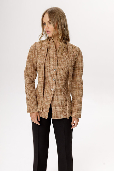 Приталенный твидовый жакет с акцентными плечами и съемным шарфиком (приобрести брюки с фото можно по арт. 6557, приобрести юбку с фото можно по арт. 6612).