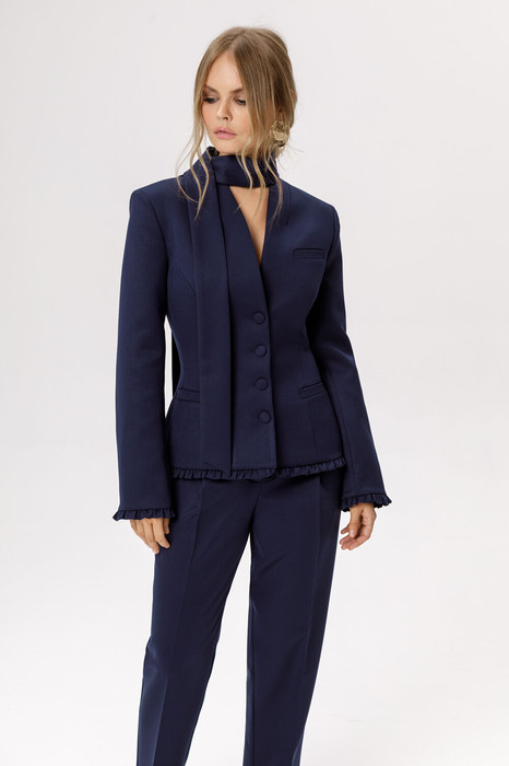 Приталенный жакет с оборками и съемным шарфиком (приобрести брюки с фото можно по арт. 6292 или 6343).
