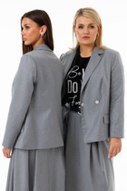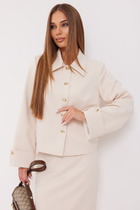 Силуэтный жакет с подчеркнутой линией талии. Смещенная застежка на петлю и пуговицу. Воротник пиджачного типа с отложными лацканами, край борта скругленный по низу жакета. Спереди обработаны прорезные карманы в рамку с клапанами и нагрудный прорезной карман с листочкой. Рукава втачные, двухшовные с отлетнымм шлицами. Спинка с рельефами и средним швом, переходящим в шлицу. Изделие на подкладке.