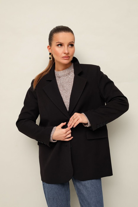Жакет актуального прямого кроя, выполнен из костюмной ткани. Воротник пиджачного типа с отложными лацканами, край борта скругленный по низу жакета. Спереди обработаны прорезные карманы в рамку с клапанами. Рукава втачные двухшовные со шлицей и пуговицами. Спинка со средним швом, переходящим в высокую шлицу с застежкой на петли и пуговицы. Жакет на подкладке.
