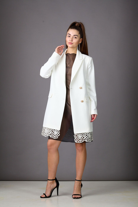 Ах , какая находка - пиджак женский с кружевом ! Молочный теплый цвет пиджака прекрасно сочетается с изысканным кружевом по низу. Пиджак прямого силуэта с двубортной застежкой и прорезными карманами с клапанами. Воротник-с отложными лацканами пиджачного типа. Рукава двухшовные, длинные. Только представьте, как изысканно будет смотреться это нежное изделие в комплекте с атласным платьем, юбкой или как представлено на фото с платьем из вуали! А можно носить просто, как самостоятельную вещь! Длина жакета 44-48р - 82см +10см кружево, 50-54р- 84см+10см кружево