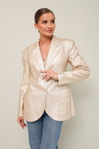 Куртка женская из текстильной ткани (джинс) прямого силуэта. Куртка без подкладки. По переду расположены накладные карманы с клапаном, в боковых подрезах расположены карманы. Спинка с рельефами и кокеткой, плечо спущенное. Рукав двухшовный с манжетой. Вырез горловины обработан воротником. Куртка застегивается на кнопки.