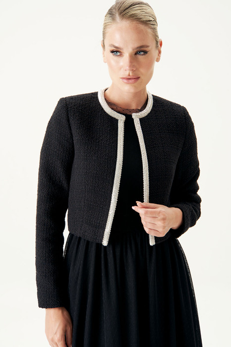 Этот изысканный твидовый жакет станет идеальным акцентом для создания элегантного и женственного образа. Выполненный в классическом черном цвете с фактурной тканью, он дополнен утонченной серебристой отделкой, которая подчеркивает его изысканный стиль. Минималистичный крой с округлым вырезом и укороченная длина делают его универсальным дополнением как к вечернему платью, так и к повседневному ансамблю. Этот жакет подчеркивает тонкий вкус и добавляет нотку роскоши вашему гардеробу. Носите его с элегантными лодочками и минималистичными аксессуарами для завершения образа.
