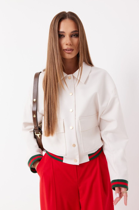 Жакет  укороченный из костюмной ткани. Застёжка по переду на кнопки. По переду накладные карманы с клапаном. Воротник отложной. Рукав прямой на трикотажной манжете. Низ жакета на трикотажном поясе. Жакет на подкладке.