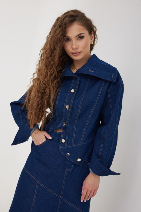 Жакет женский, из джинсовой ткани, объемный в верхней части и полуприлегающий в области талии, с подрезом и фигурной баской, длиной выше линии бедер. Застежка на планку с петлями и джинсовыми пуговицами. Воротник высокий стояче-отложной застегивающийся на две пуговицы. Жакет с удлиненной линией плеча, рукав свободный длинный с вертикальными швами, по низу с манжетами, застегивающимися на пуговицу. Спинка с кокеткой и рельефами, перед с двойными рельефами от плеча до линии подреза. Все швы отстрочены контрастными нитками.