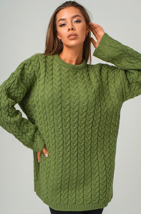 Окутывающий нежностью и заботой женский свитер выполнен из акрила и шерсти. Удлиненный силуэт, крой оверсайз, фактурная вязка коса, уютные широкие рукава – в этом джемпере для женщин есть все, что поможет оставаться стильной в любой ситуации!