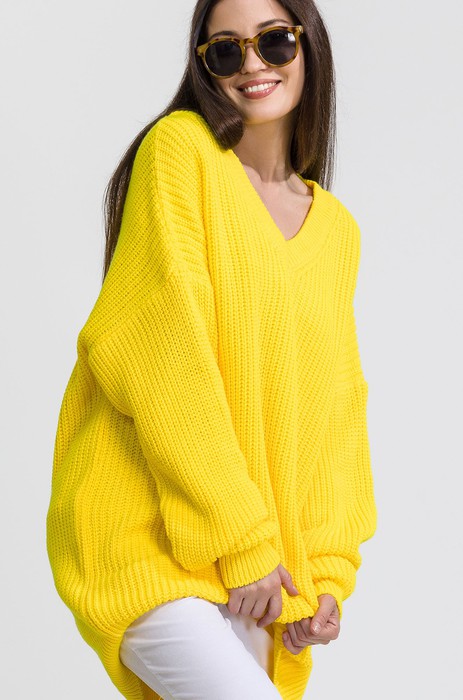 Женский удлиненный джемпер оверсайз с V-образным вырезом подчёркивает ключицы, аккуратно открывает шею, раскрывая изящность своей обладательницы. Благодаря свободному крою и минималистичному дизайну желтый свитер oversize надолго сохранит свою актуальность.