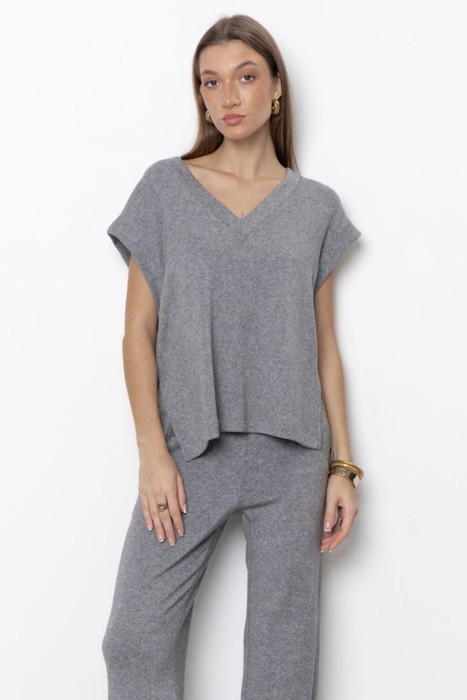 Жилет свободного силуэта с V-образным вырезом и расслабленными приспущенными рукавами.