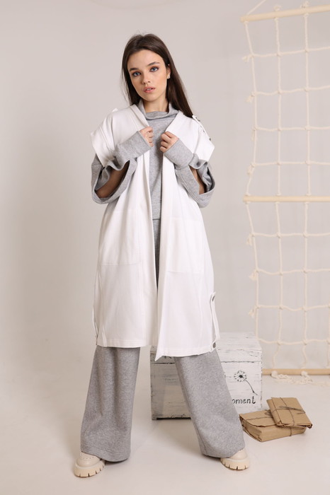 Жилетка   "АМУЛЕТ" с декоративными патами на плечах и по низу, невероятно комфортная и красивая одновременно. Эта жилетка  будет самой любимой в Вашем гардиробе. Все изделия коллекции "АМУЛЕТ" созданы из натуральной ткани, имеют сложно-обработанные внутренние швы и энергосберегающий крой.