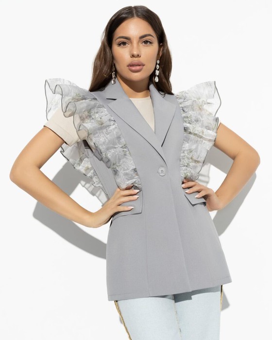 Ради собственного интерна посчитайте, сколько раз за день вы услышите фразу «Это восторг!». Объемные рюши на жилете в деловом стиле – это, действительно, восторг. Записали первый раз?