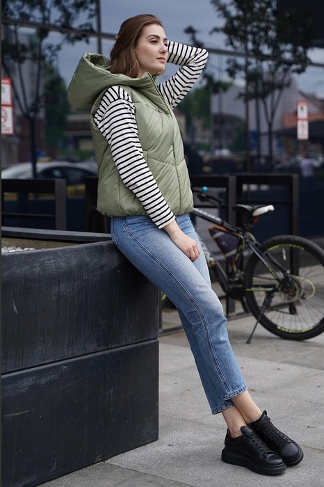 Современный объемный жилет с застежкой на витую молнию и карманами листочками, станет отличным дополнением любого гардероба. Жилет выполнен с высокой стойкой и глубоким удобным капюшоном для защиты от ветра. Длина жилета по спинке ок.58см.Рост 170 см Состав: полиэстер - 100%, утеплитель: Air Twin Light 100 г/m2 Р-ры 42-52 Цвет: оливковый Цвет одежды может незначительно отличаться от оригинала.