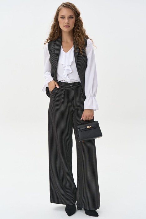 Жилет классического силуэта без рукавов, выполненный из ткани в тонкую вертикальную полоску. V-образный вырез и аккуратный ряд пуговиц создают сдержанный и элегантный образ. Приталенный крой подчёркивает фигуру, а строгий рисунок добавляет графичности.