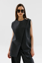 Жилет выполнен из глянцевой плащевой ткани, простеганной с изософтом. Жилет прямого силуэта, длиной миди. Спереди застежка на молнию и кнопки на планке. Карманы прорезные, застегивающиеся на молнию. Спинка со средним швом. Воротник-стойка. Капюшон съемный, крепится на пуговицы. В комплект входит съемный ремень из широкой эластичной тесьмы с пряжкой-карабином. Жилет на притачной по низу подкладке.