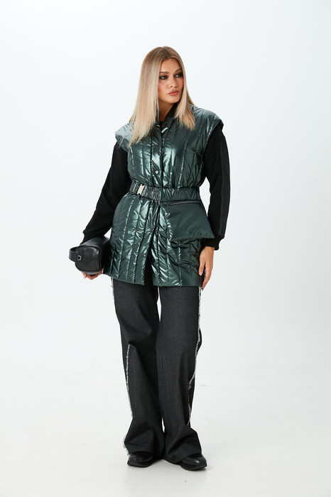 Утеплённый жилет из стёганой ткани. Застёжка на кнопки, по бокам расположены карманы. В комплекте идёт эластичный ремень, который дополняется съёмным карманом-сумкой. Жилет на подкладке.