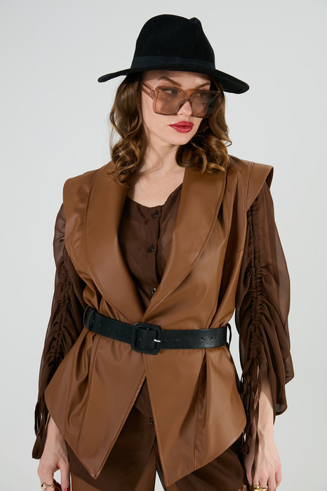 Жилет удлиненный свободного прямого силуэта, воротник пиджачного типа. Линия низа по переду и спинке фигурная ассиметричная. Короткий рукав-крылышко. Талия фиксируется съемным ремнем из экокожи, для которого в боковых швах оформлены шлевки. Ремень идёт в комплекте к изделию.