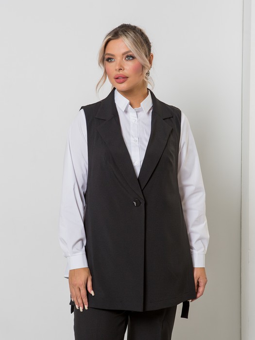 Повседневный жилет оригинального кроя без боковых швов, свободного силуэта, выполнен из костюмной ткани. Глубина прилегания по фигуре регулируется поясами с полукольцами на уровне талии. Жилет с классическим английским воротником и отложными лацканами. Пройма свободная углубленная. Жилет с застежкой на одну пуговицу. Спинка со средним швом. Подойдет для офисного гардероба и будет хорошо сочетаться с водолазками, рубашками и блузами. Жилет без подклада. Длина изделия по спинке в 48 р-ре – 76 см. в 64 р-ре – 85 см.
