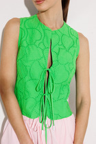 Повседневный жилет оригинального кроя без боковых швов, свободного силуэта, выполнен из костюмной ткани. Глубина прилегания по фигуре регулируется поясами с полукольцами на уровне талии. Жилет с классическим английским воротником и отложными лацканами. Пройма свободная углубленная. Жилет с застежкой на одну пуговицу. Спинка со средним швом. Подойдет для офисного гардероба и будет хорошо сочетаться с водолазками, рубашками и блузами. Жилет без подклада. Длина изделия по спинке в 48 р-ре – 76 см. в 64 р-ре – 85 см.