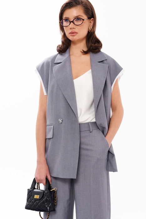 Жилет женский из смесовой ткани для повседневной носки. Жилет прямого силуэта. Жилет двубортный на одну обметанную петлю и одну пуговицу. Перед имеет две талиевые вытачки и два кармана с клапаном и двумя обтачками. Спинка разрезная с регулирующимся хлястиком. Горловина обработана пиджачным воротником. Жилет без рукавов, по пройме имеется вставка из другого материала. Жилет на поливискозной подкладке. Очень стильный жакет, в котором вы обязательно очаруете всех своим внешним видом. А главное в данном жилете вы всегда будете в центре внимания.