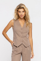 Классический жилет из текстильной ткани. Детали: жилет полуприлегающего силуэта с фигурным низом, застежка на петли и пуговицы, на подкладке