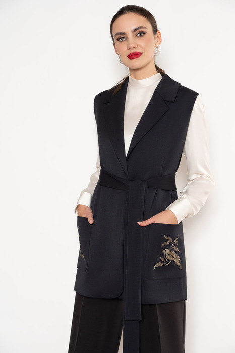 Горловина квадратная с втачным воротником пиджачного типа. Средняя длина жилетки по среднему шву спинки - 79,0 см (±1,5 см) Тип ткани: костюмно - плательная.
