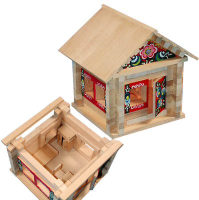 Материал - береза, всего 105 деталей. Высота собранного домика 16 см. Можно собрать два вида домика: есть план строительства для одного и рисунок другого. Часть деталей (фронтоны, окна и двери) украшены росписью, по мотивам городецкой. В комплект входит миниатюрная мебель: кровать, шкаф, стол, стул. Мебель подходит для игрушек высотой 5-6 см. ( как из киндер яиц).