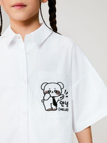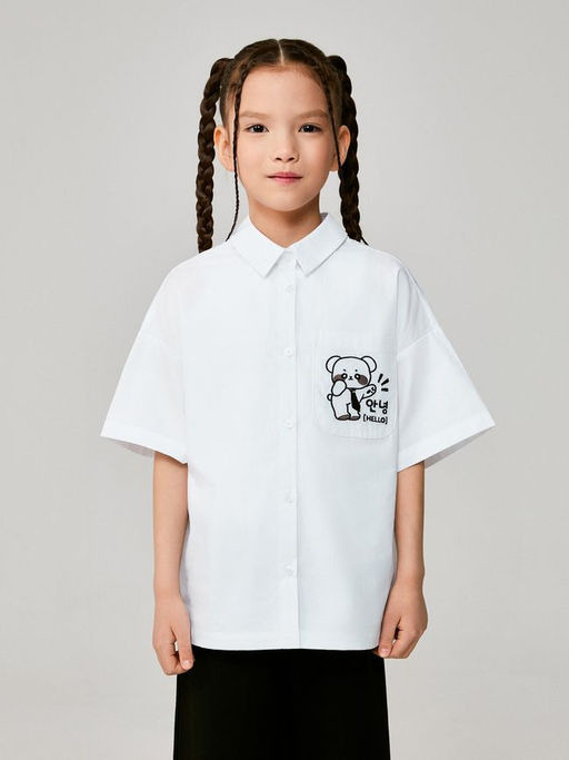 Блузка оверсайз с иероглифами и принтом для девочки - сочетание комфорта и стиля для школьных будней. Необыкновенная модель прямого силуэта cо спущенной линией плеча.. Блузка выполнена из мягкой и дышащей хлопковой ткани, которая не требует сложного ухода. Короткие и просторные рукава делают модель подходящей для теплой погоды. Застежка центральная на пуговицы и петли. Классический рубашечный воротник придаёт изделию завершенный строгий вид. Спереди размещён накладной карман, декорированный вышивкой в японской стилистике с надписью "Привет!" на двух языках.