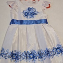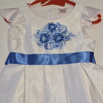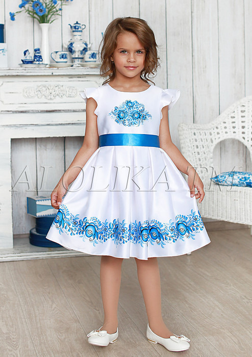 Описание: Очаровательное платье для девочек, выполнено из атласа с принтом "гжель". Модель с рукавами-крылышками и круглым вырезом горловины, застежка-молния на спинке. Линия талии подчеркнута синим поясом, который завязывается в бант, подол пышной юбки украшен узором "гжель." Наличие хлопковой подкладки обеспечивает комфорт для нежной детской кожи.
