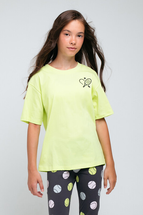 Однотонная футболка из тонкого хлопкового трикотажа супрем. Украшена принтом на груди. Короткие рукава со спущенными плечами и низ изделия обработаны плоскими швами.