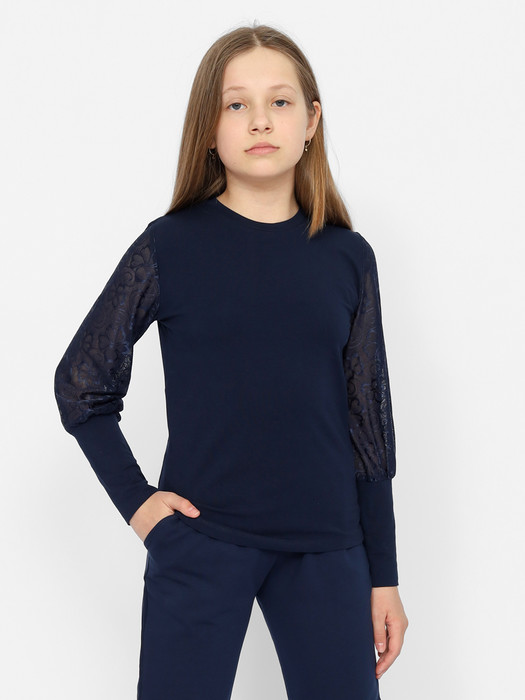 Джемпер для девочки с длинными втачными рукавами. Рукава из сетки с рисунком и высокими манжетами из основного полотна. Горловина круглая, обработана притачной бейкой из основного полотна.