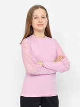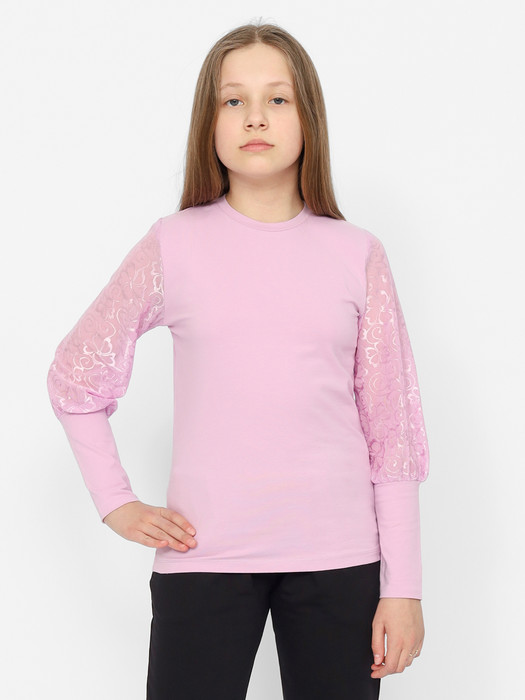 Джемпер для девочки с длинными втачными рукавами. Рукава из сетки с рисунком и высокими манжетами из основного полотна. Горловина круглая, обработана притачной бейкой из основного полотна.
