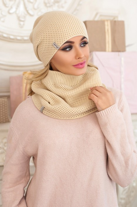 Вязаный женский комплект «Жаклин» состоит из двухсторонней шапки и шарфа-хомута. Вязка мелкая узорная. Головной убор украшен тканевой лентой в виде логотипа торговой марки Braxton. Шарф имеет флисовую подкладку, которая отлично согревает и не пропускает холод к шее. Флис считается достаточно ценным материалом с теплоизоляционными характеристиками. Он имеет небольшой вес, хорошо вентилируется и сохраняет комфорт во время носки. При создании комплекта используется натуральная ангора, которая отличается повышенной гигиеничностью и эластичностью.