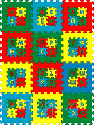 Коврик собирается из 12 больших квадратов (29х29 см),в каждом из которых собираются квадраты еще из четырех квадратов (10х10см),а в каждом маленьком квадрате находится паззл – буква, цифра или математический знак.Таким образом, играя на этом коврике,ребенок имеет возможность одновременно изучать и буквы, и цифры,и даже составлять элементарные математические примеры.Коврик мягкий, теплый, безопасный и очень яркий. Толщина деталей 1 см.Материал: вспененный полиэтилен.