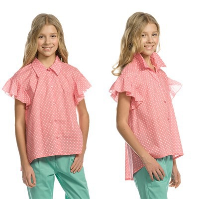 Рубашка А-силуэта из ткани в горох. Короткий рукав-воланчиком, приспущенное плечо, пройма окантована. Существенный перепад длин между передом и спинкой. Центральная застежка на мерцающих пуговицах с блестками, отложной рубашечный воротник.