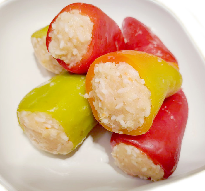 Состав: перец сладкий, курица/индейка рубленая, рис отварной, морковь, лук репчатый, чеснок, перец чёрный, лавровый лист, соль