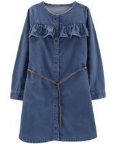 Новое платье известного, американского бренда Carters, Belted Denim Shirt Dress. Практичное джинсовое платье с длинным рукавом и рубашечным покроем. Впереди планка с пуговицами и декоративным воланом. Замшевый пояс с «DD» пряжкой в комплекте. Подходит для машинной стирки. Состав: 100% хлопок. Размер: для девочки 8 лет, ростом 131-136 см, весом 27-32 кг.
