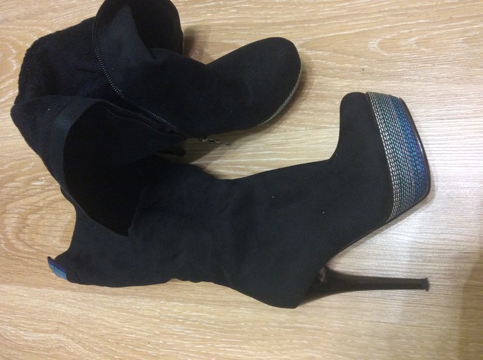 Чёрные сапоги, искусственная замша. Красиво облегают. Надевала 2 раза. Каблук 12 см; платформа 3 см. Длина по стельке 23 см
