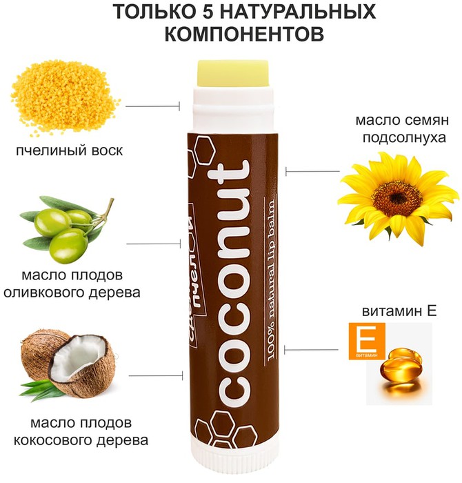 В составе бальзама 4 компонентов. Пчелиный воск разглаживает мелкие трещинки на коже, смягчает, препятствует испарению влаги с поверхности кожи, обеспечивает антибактериальную защиту.