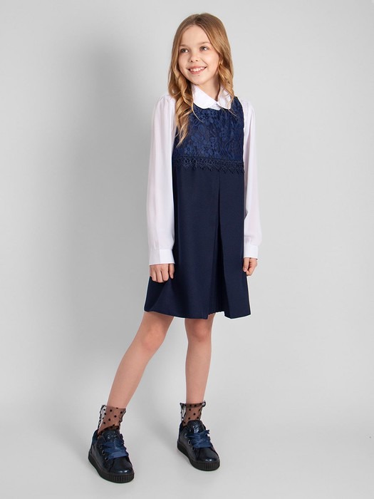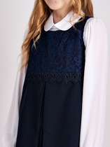 Сарафан с круглым вырезом, прямого силуэта. Передняя полочка декорирована цветочным кружевом. Модель с плиссированной вставкой на юбке. Идеальный выбор для создания элегантного школьного образа.