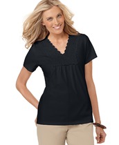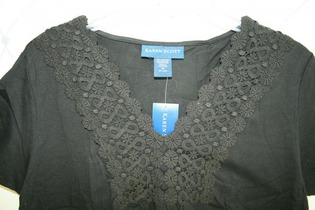 Новый топ известного американского бренда Karen Scott, Top Crocheted V-Neck. Повседневный топ Karen Scott с классическим V-образным вырезом, украшенным вязаными кружевами. Короткие рукава и прямой низ. Машинная стирка. Сделано: в Малайзии. Цвет: Ebony Black. Состав: 100% хлопок. Размер: M. Замеры: длина по спинке 66 см, ширина между плечевыми швами 40 см, ширина между подмышками 46 см, ширина подола 53 см, длина рукава по внешнему шву 18 см, длина рукава по внутреннему шву 5 см.