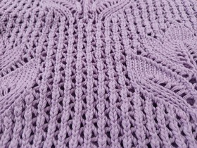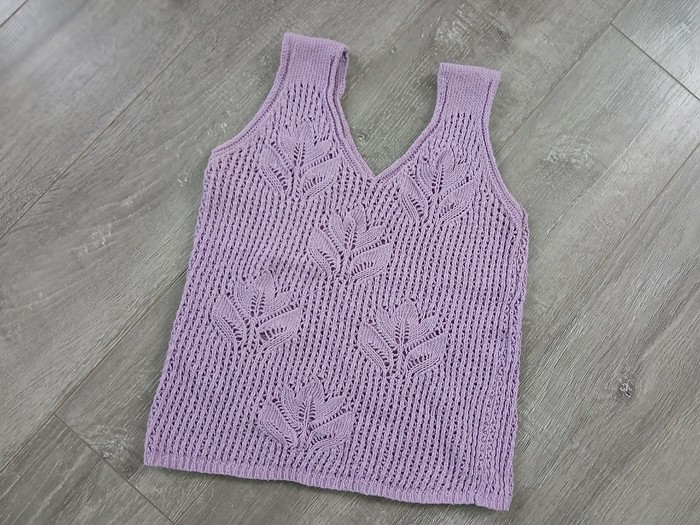 Сиреневая майка с узором из переплетенных стеблей и листьев. Изготовлена из хлопка с добавлением акрила для комфорта и долговечности. Размер XS (40). Длина изделия — 44 см; ширина — 32 см. Подходит для повседневного ношения.
